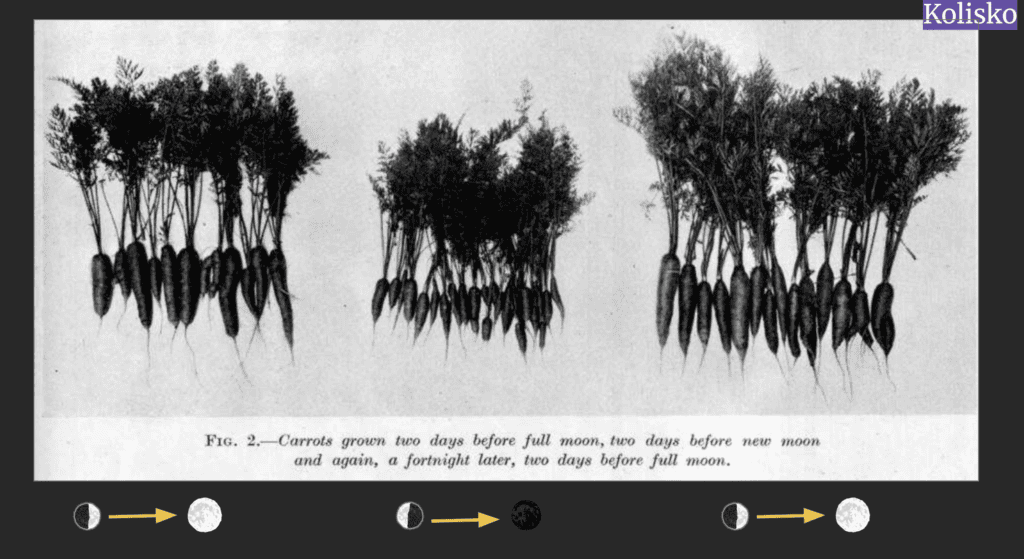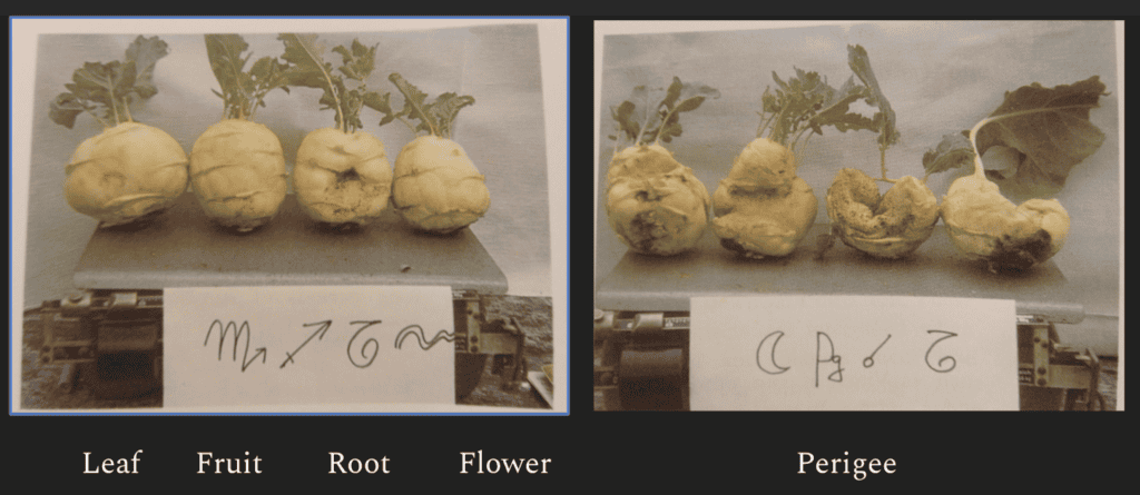 Root crops sown on Leaf days produced strong leaf development but small roots and did not store well. When kept in the cellar, they shrivelled early in winter. By contrast, root crops sown on Root days kept much longer.”
