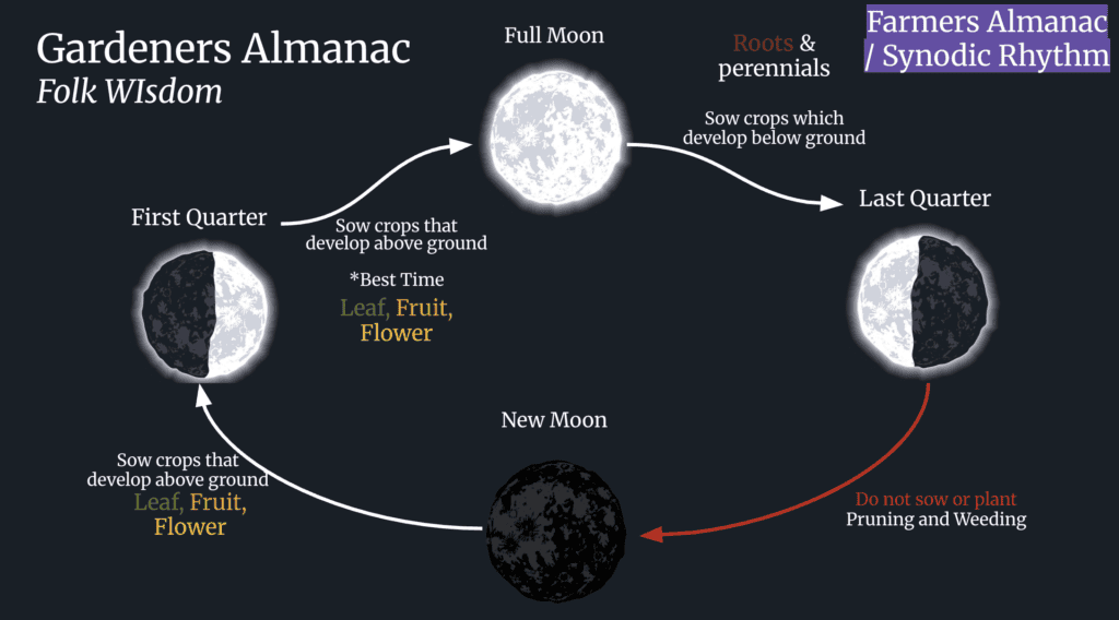 Over time, the Almanac has incorporated regional frost dates and long-range weather forecasting, but the core lunar planting method has remained relatively consistent. This approach works primarily with the synodic lunar cycle — the visible phases of the Moon — and does not generally take into account the Moon’s position in the zodiac or the broader planetary relationships that are central to biodynamic agriculture.