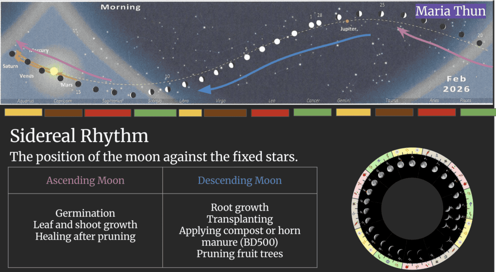 The Maria Thun Biodynamic Calendar is an annual agricultural calendar based on decades of experimental research carried out by Maria Thun. Its central principle is the sidereal rhythm of the Moon — meaning the Moon’s position in front of the constellations of the zodiac — rather than simply its visible phases. Through systematic sowing trials, Thun observed that when the Moon passes through certain zodiac constellations, different parts of the plant are stimulated.