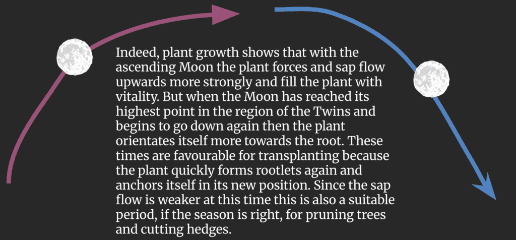 The Moon promotes the reproductive forces of all living plants, that it creates the force which pushes upwards through the plant from the root right on into the seed as it is being formed in the fruit.”