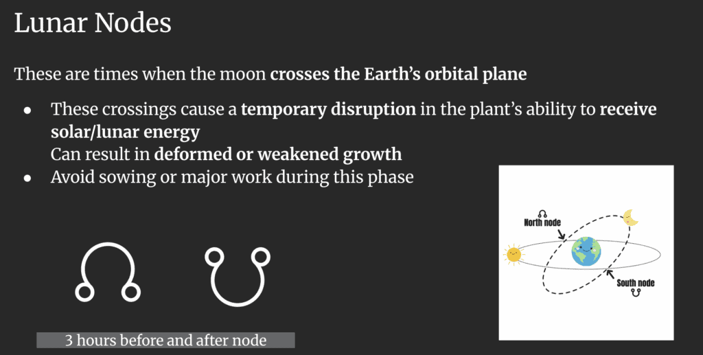 ☊ Ascending Node — The point where the Moon crosses the ecliptic moving northward; often considered a time of disturbance in plant growth.