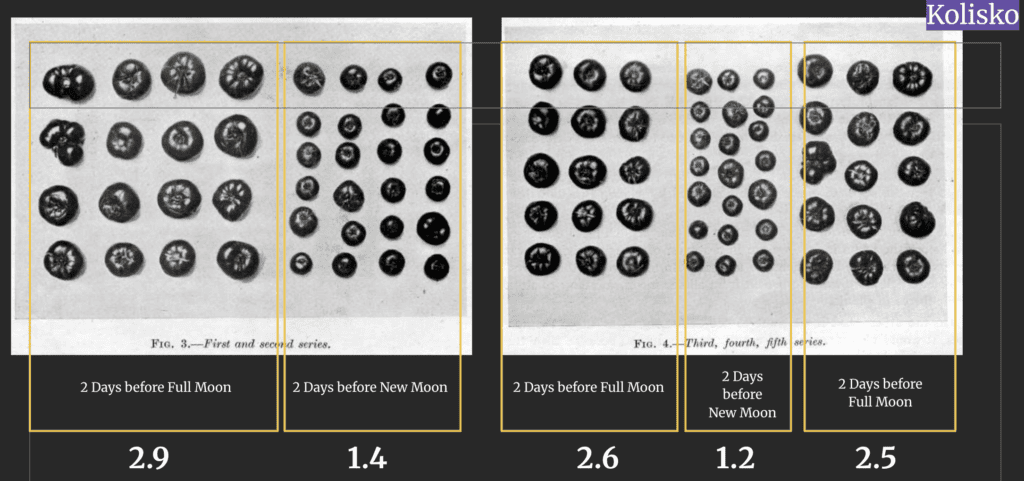 These experiments showed very clearly which were the most favourable days during the year. The best results, the biggest plants, we found nearly always two days before full moon, sometimes three or four days before full moon.