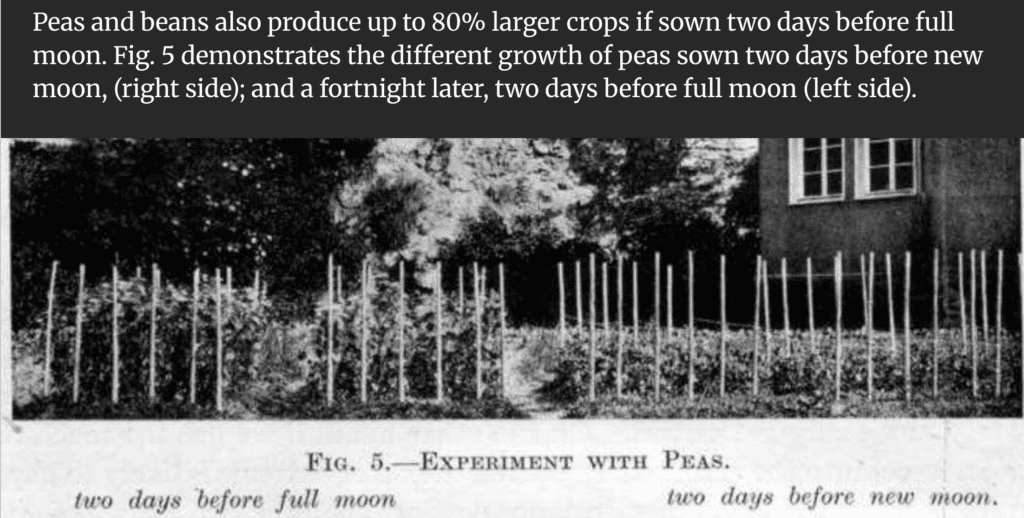 “If something to be grown is placed in the soil at new Moon instead of at full Moon, it will wait until the Moon is again at the full, and, regardless of human error, work in accord with Nature. Thus, men make use of the Moon without having the least idea that they are doing so.