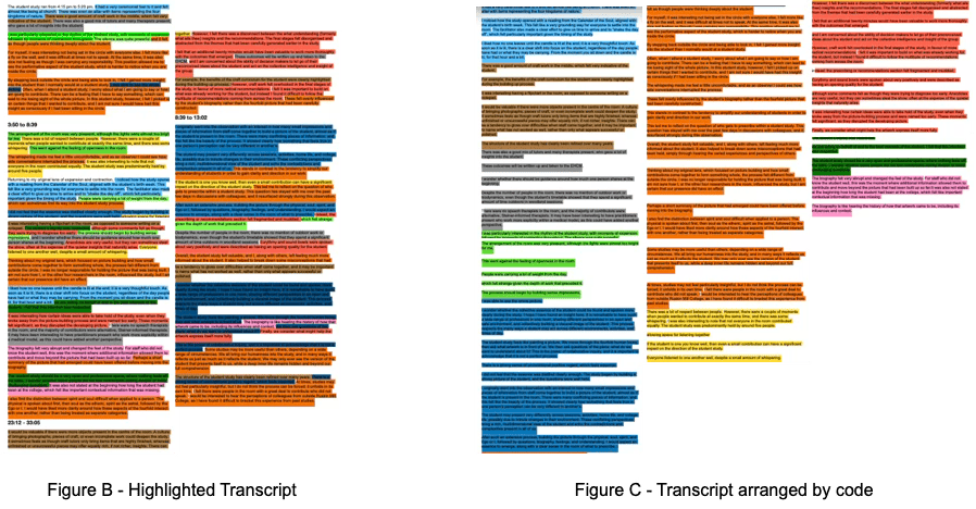 Once I had highlighted the codes within the transcript (Figure B), I reorganised the data by grouping sentences according to their respective categories (Figure C), aligning with Kiger and Varpio’s (2020) description of the transition from coding to theme development. Collating the data in this way enabled me to visualise how frequently I spoke from each mode of knowing. As anticipated, reflexive knowing was the most prominent category, as this had been my intended focus. What surprised me, however, was the extent to which diagnostic knowing and integrated knowing appeared throughout the transcript.