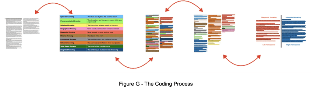 Through my thematic analysis of the data and the process I underwent (Figure G), I perceive a dance between diagnostic knowing and integrated knowing, both from my inner experience as a researcher in the room and from an outward perception of the student study.