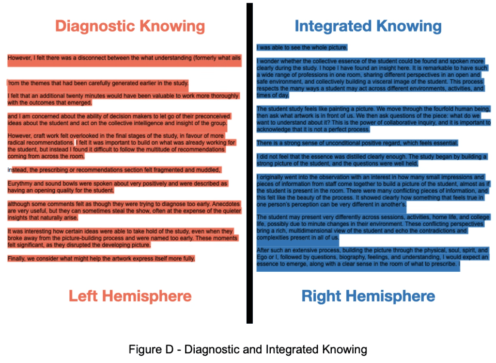 Drawing on the work of Iain McGilchrist (2009), this shift toward diagnostic framing may reflect a broader cultural tendency to privilege left hemispheric modes of attention. In this mode, understanding emerges through categorisation and explanation. By contrast, the earlier picture building process of the student study reflects a more integrative mode of attention, in which the student gradually emerges through relational and contextual understanding.