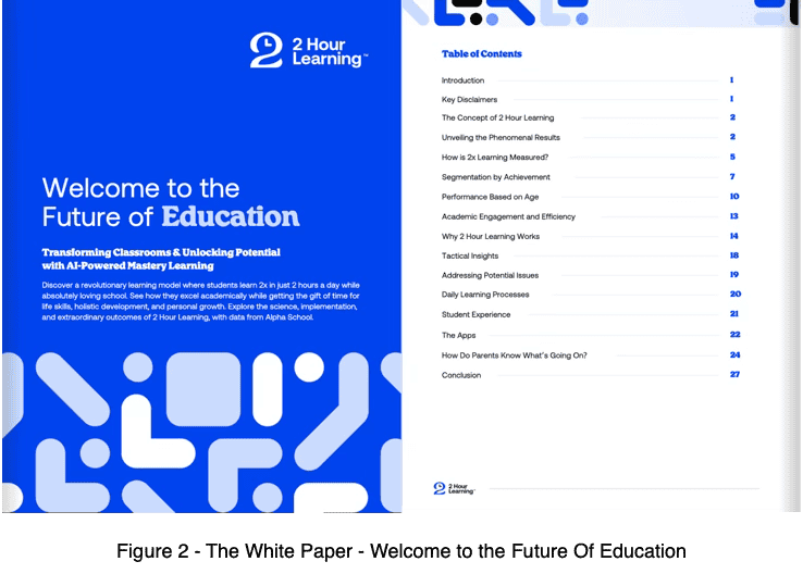The white paper states that when Alpha School first opened, they did not offer a kindergarten class because they assumed children were too young to learn via apps. “We were proven wrong – our youngest learners excelled in this environment” (2HL White Paper, 2024, p. 11). Alpha School and 2HL are therefore presented as a solution for education from kindergarten to grade 12, with even the youngest children being measured metrically and positioned in the top 1% after attending Alpha School. Metrics are used extensively throughout the paper to suggest that Alpha students are academically elite, due to the effectiveness of AI tutoring which allows them to achieve more in less time. The phrase “2x” (twice as fast) appears 21 times in the document, and percentages are repeatedly used to market high performance, such as the claim that “students averaged in the top 1–2% for every subject” (p. 4).