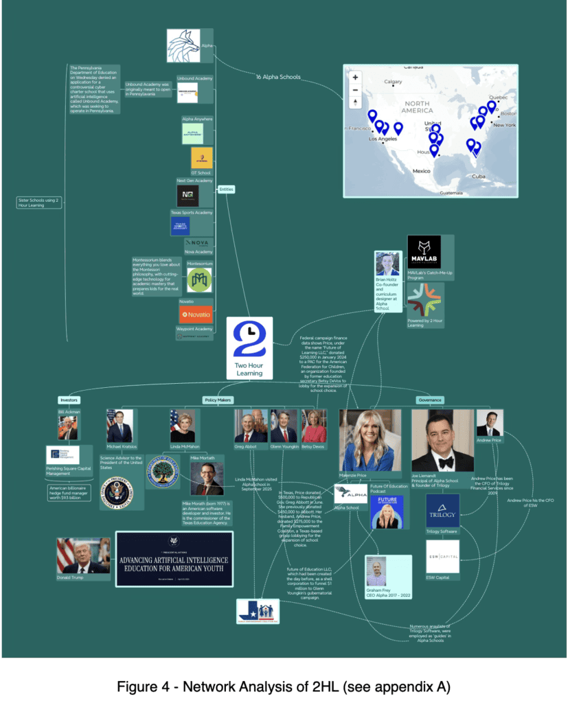 I conducted a network analysis of 2HL to better understand the ideological positioning of the model (Figure 4), as well as the mechanisms through which it is gaining influence and visibility across the United States. This analysis revealed the growing prevalence of the model, with numerous schools unaffiliated with Alpha Schools adopting 2HL technology. It also highlighted multiple instances in which 2HL, or subsidiaries linked to Trilogy Software, have made financial contributions to political organisations, suggesting an effort to engage with and potentially influence education policy. Notably, this includes multiple donations to the Texas Family Empowerment Coalition, amounting to over $1 million (Elwood, 2025). It also positions Alpha Schools on the right of American politics. Taken together, this network illustrates how closely connected these actors are and how strategically positioned they may be to scale their model and shape education policy, particularly following the signing of a presidential action on 23 April 2025 to advance the use of artificial intelligence in education (The White House, 2025).